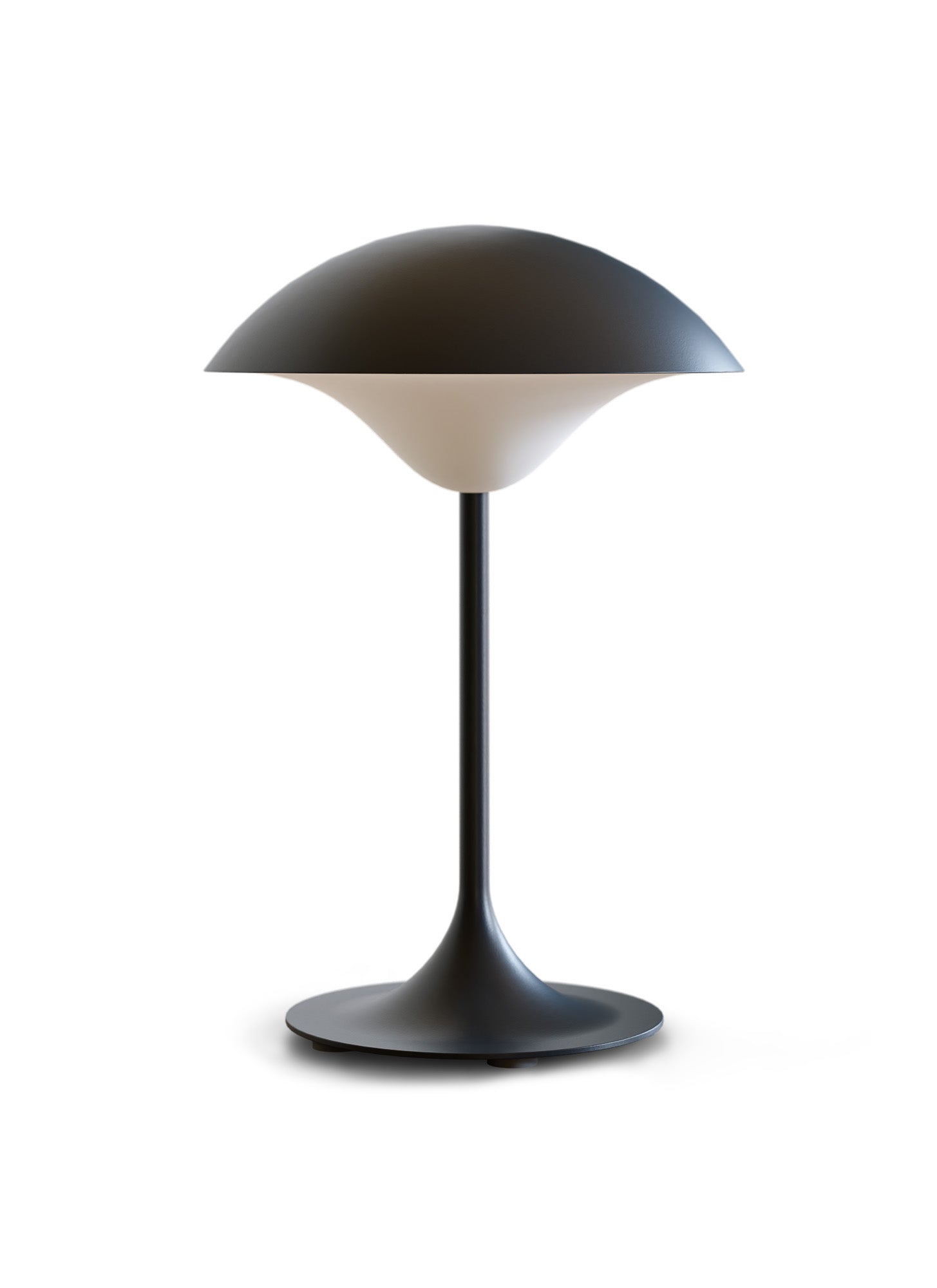 On the underside, this smooth surface is broken by a moulded plastic surface that curves down towards the stem of the lamp.